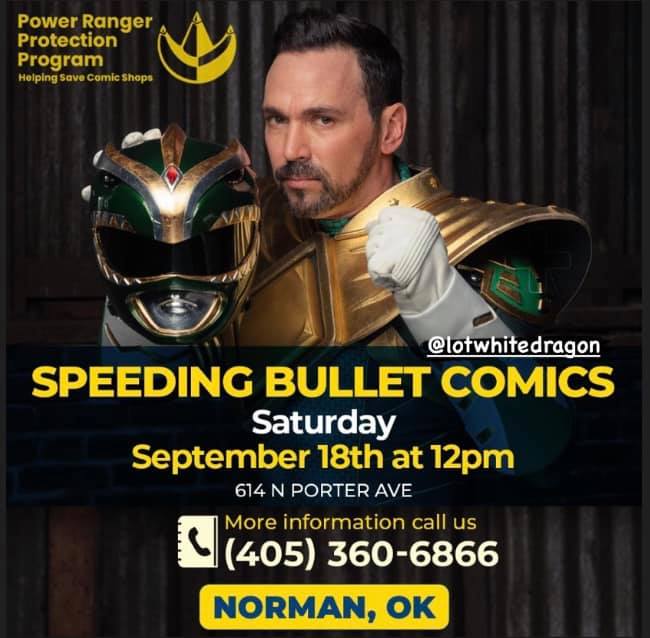 Jason David Frank, who starred as Tommy Oliver in the series Mighty Morphin Power Rangers, Power Rangers Zeo, Power Rangers Turbo and Power Rangers Dino Thunder, will appear beginning at noon Sept. 18 at Speeding Bullet Comics, 614 N Porter Ave. in Norman. Frank recently completed shooting the action film “Legend of the White Dragon.”